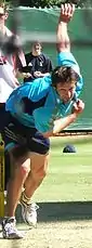 Hilfenhaus returned to the Test side when it travelled to England where they would face Pakistan in two Tests in July. His knee was still painful, but Hilfenhaus played regardless.[24] The series was drawn 1–1 and Australia's fast bowlers were often inconsistent.[25] Hilfenhaus was Australia's second highest wicket-taker in the series, with eight at an average of 23.75.[26] In October Australia toured India for two Tests and Hilfenhaus was included in the 15-man squad.[27] At this point, India were the number one ranked Test team in the world and Australia had dropped to fourth.[28] India won both Tests and Hilfenhaus' six wickets for 261 runs made him Australia's second highest wicket-taker in the series.[29][30]