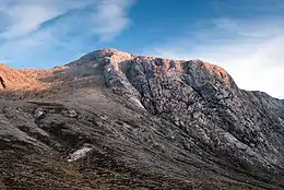 Bencorr sits on its own mini-massif and is linked by a short high rocky north-eastern ridge to Bencorr North Top at 690 metres (2,260 ft), which gives Bencorr the profile of a "double summit" when viewed from a distance. One of Bencorr's more distinctive features is its long rocky north-easterly spur, known as Carrot Ridge (Irish: Meacan Buí), on which sits the subsidiary peaks of Binn an tSaighdiúra 653 metres (2,142 ft) (whose prominence of only eight metres, making it an easy peak to miss), and at the far end of the spur, Bencorrbeg 577 metres (1,893 ft).[5][7]