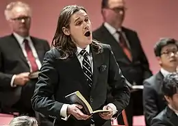 Benedikt Kristjánsson (born 1987)[1] is an Icelandic operatic and concert tenor who is based in Germany and has appeared internationally. He focuses on Baroque music, especially by Johann Sebastian Bach, but has also performed and recorded Romantic lieder and contemporary music. He has performed Bach's St John Passion in an arrangement for one singer, keyboard and percussion, notably in a live broadcast from Bach's resting place at the Thomaskirche on Good Friday 2020.