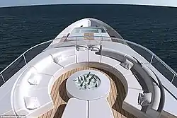 The exterior bears a strong feature line flowing from the front and swooping to the rear on each of its three decks,[15] with carbon fiber shark fins and three parallel stainless steel bars below the bow.[4][5][16] The interior features floor-to-ceiling glass walls in places and extra-wide staircases.[1][5]