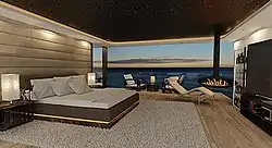 The boat has six bedrooms, including a master suite with floor-to-ceiling windows, a fireplace, retractable ocean-view terrace, minibar, library, curved television, walk-in closets, a staircase leading to a private home theater and a ceiling that recreates the night sky.[5][17] There are six cabins to house up to 12 guests, the staff quarters allow for 11 crew members, and the entertainment space accommodates over 100 people.[3][5][18] The boat includes a spa, several bars, an elevated Jacuzzi with an ocean view, a gym and a movie theater.[5][18] The living room fits 12 people and has a bar facing the ocean. The sun deck comes with a dining table, bar and dual-use fire pit that can also serve as a giant ice bucket.[18] It also includes water toys such as jet skis and a 6.5-meter tender.[19]