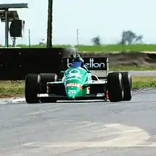The B186 finished in the points in the first three races of the season, including a podium for Berger at the San Marino Grand Prix. However, the car's underlying speed was blunted by a run of retirements for both drivers, and uncompetitive showings at events run on tight tracks such as the Monaco and Detroit Grands Prix. Nevertheless, Berger, in particular, had emerged as a consistent frontrunner by mid-season, although he was criticised in some quarters for driving with his turbo boost set too high for the car's fuel consumption in the early stages of a race in order to complete "glory runs" near the front, only to drop back later on.[10] The B186 was a very aerodynamically efficient car and enabled it to be most competitive in terms of raw pace at the five high-speed "power circuits" on the calendar: Imola, Spa, Hockenheim, Monza and the Österreichring. In addition to being the fastest car on the straights, the car was also very good through high-speed corners; Berger and Fabi were both running very well at the British Grand Prix at Brands Hatch and the Austrian Grand Prix at the Österreichring. The Austrian event saw the B186s to be significantly faster than the usual frontrunning teams such as Williams, McLaren and Lotus, and the team was set for a dominant 1-2 finish until Fabi over-revved his engine by lifting his rear wheels off the ground on a kerb, causing it to fail several laps later, and home town hero Berger's battery failed, causing him to lose five laps in the pits having a new one fitted. The McLaren and Williams cars- two of the other most aerodynamically efficient cars (although slightly down on power) were the only other cars able to keep up with the Benettons at the Österreichring.[5] Fabi took a pole position there, and a further one at Monza where problems on the warm-up lap saw him forced to start from pit lane. However further unreliability and less efficient fuel consumption than rival engines prevented a victory. Berger finished a lap down in 5th while Fabi retired on lap 44 with a tyre blowout.