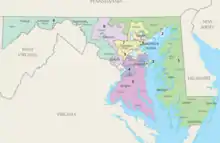 Maryland has traditionally been a Democratic-heavy state, and according to FiveThirtyEight, non-gerrymandered or proportionally partisan districts in Maryland could range from four to six likely Democrat seats,[4] suggesting that a proper redistricting of the state's eight districts would result in four to six districts favoring Democrats, and two to four either favoring Republicans or remaining competitive. Democratic analysts envisioned the possibility of an "8–0 map" which aspired to shut Republicans out of elections altogether; however, this may have endangered some incumbents, who rejected the proposal because they wanted to stay in office more easily.[5] However, Democratic leaders saw the potential to create a district map that would give Democrats seven districts to the Republicans' one, or the "7–1 map". The state Democrats drew on services from the National Committee for an Effective Congress (NCEC) to determine how to create this "7–1 map".[6] The issue was how to remap the two Republican-leaning districts, the 1st and the 6th. After reviewing options, advisers and mapmakers settled on remapping only the 6th district, because redrawing the 1st district to achieve their goal would have split the district across the Chesapeake Bay, an undesirable outcome.[6] Ultimately, a 7–1 map favoring Democrats was implemented.[4][5]