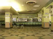 The interior was seemingly unchanged through the years. Its columns and walls were painted in bright greens and yellows with chrome siding, it had a stainless steel edged counter with rows of chrome counter stools, and terrazzo floors, laminate wall covering, and a ceiling with indirect lighting coves.[1] The chairs were bright yellow, orange and green. Walls were covered in photographs of celebrities who had dined at the restaurant; one spot was dubbed "Bens Wall of Fame". Bens employed only waiters, who wore a black bow tie and white buttoned shirt with black dress pants and shoes, along with a white waist apron.