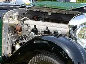 The straight-six engine used a one-piece iron block and non-detachable cylinder head with a crankcase made from Elektron, a magnesium alloy. It featured an overhead camshaft driven by a Bentley patented "three-throw drive" system of triple connecting rods[4][7] with, like all earlier Bentleys, four valves per cylinder and twin-spark ignition (coil and magneto), which were state-of-the-art at the time.[5][8] The engine had a bore of 110 mm (4.3 in) and a stroke of 140 mm (5.5 in),[3][9] giving a capacity of 7,983 cc (487.2 cu in).[3][10][9] Pistons were of an aluminium alloy.[11]