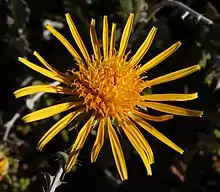 It is a perennial meso-chamaephyte that grows 15–25 cm high.[2] It has prickly leaves and grows dark yellow aster flowers.