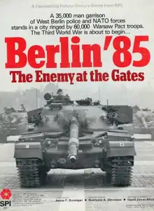 Berlin '85 is a game set in the 1980s during the Cold War in which the NATO forces in Berlin, consisting of French, British, and American military units, and West Berlin Police, are attacked by Soviet/Warsaw Pact units in a battle of time and attrition.[1] The game uses SPI's "Modern Battles Quad" rules with new rules for urbanized terrain, subways, fire storms, gas warfare, rubble, police, supply and airpower.[2]