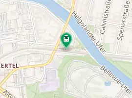 The station is located about 2 km (1.2 mi) west of Berlin Hauptbahnhof, close to the Spree river and the southern rim of the Moabit quarter. Beside Bellevue Place, the Victory Column and Tiergarten Park can be reached in the vicinity. The adjacent Modernist residential area was largely rebuilt as part of the 1957 Interbau exhibition.
