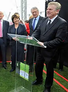 ![]() Gérard Caudron, Bernard Derosier and Martine Aubry during the laying of the foundation stone of the Grand Stade de Villeneuve d'Ascq. | |