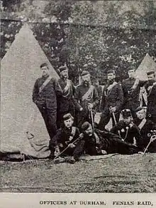 Opposed to the Fenian raids into Canada, although not unsympathetic to their cause of freedom for Ireland, Devlin was for fifteen years (1851-1866) closely identified with the active volunteer militia force.[1] The militia also functioned as a further point of social activity and provided a platform for his political aspirations.[30] Devlin organized an Irish Company for the 1st, or Prince of Wales Rifle Regiment, serving initially as a captain, later as Lieutenant-Colonel, of the unit. In this capacity he commanded the regiment during the Fenian raids of 1866, assigned to guard the border from Huntingdon to Hemmingford, Quebec, opposite New York State. For his services Devlin was publicly commended by Charles Stanley, Lord Monck, then Governor-General of Canada. He retired his command, retaining his rank, in August 1866.[16][5][1]