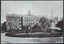 The building was erected in the late 1860s for the Evangelical Seminary Teachers, linked to a medium-sized state school in Bromberg.[1] The seminar has been created on May 1, 1820, one of three centers of this type in Grand Duchy of Posen.[7] The facility trained teachers for urban and rural elementary schools. From 1822, the Prussian Ministry began to part from the evangelical education institutions, where youth of all faiths were attending. In Bromberg, it was decided that the seminary would educate evangelical teachers, while in Poznan the same institution was converted into a school for catholic teachers. In Bromberg, a separate Catholic seminary would be created later on.[8] The seminary took quickly the character of a German Protestant philosophy institution from 1825. Nearby, the ancient Bernardine monastery housed in 1830 a Lutheran community. In the years 1867–1872, while partly rebuilding the monastery, an evangelical seminary was also constructed in the vicinity. At that time, it was a three-year curriculum. Seminary was financed from state resources. Courses, apart from general and pedagogical subjects, also considered singing, music instruments, as well as horticulture and handicraft.[9] After 1920, when Bydgoszcz was rejoined the Poland, massive outflow of Germans from the city let the Protestant seminary for teachers useless. The building then housed in 1923 the University of Agriculture coming from Poznan.[10] It was a 2.5 year long school which accepted applicants over the age of 17, having completed the sixth class of high school and one year of general practice in the farm. The curriculum changed to three years for boys, as a State Secondary School of Agriculture. In 1927, 86 students were enlisted, of which 46 coming from rural area. In 1935, the institution was transformed into a State High School Farm, the first in the country, culminating with the matura examination, which grants the access to university.[10] The school building provided excellent housing conditions. On the back of the property was a large vegetable and fruit garden, in addition the school had its own 90 ha farm in the vicinity of Bydgoszcz.[10]
