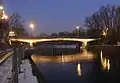 The structure's rebuilding began in 1960, and was completed in 1963. The bridge has been built by overhangs, for the first time in the country by means of movable scaffolding. The designer, Maximilian Wolff received for it the second prize from the Committee for Construction, Urban Planning and Architecture.[18] Bridge has re-opened in December 1963: it had a middle-track line for tramway, dual carriageway road with two lanes each and sidewalks for pedestrians. Partial repair occurred in 1968, a full overhaul in 2000. Since 2005, the structure is illuminated by night.