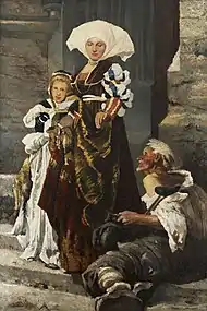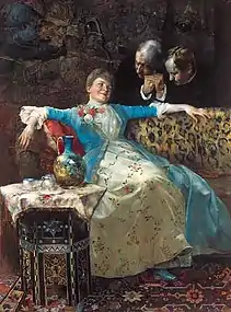 After three years as a cadet, he was sent to the Academy of Fine Arts, Munich, where he studied under Otto Seitz. He was later invited to Paris by Mihály Munkácsy and spent a year in Munkácsy's studio, improving to the point where his works could hardly be distinguished from his teacher's. He began exhibiting his genre paintings at the Salon, where they proved to be quite popular. They became a common sight in shop windows and he sought out connections with American art dealers. They proved to be as popular there and fetched high prices.[1]