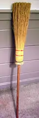 A besom is a tool used in Wicca to cleanse and purify a space which will be used for ritual. A traditional Wiccan besom is an ash stave handle with bristles made from birch twigs. These twigs are tied on using thin pieces of willow wood. It is used to cleanse the ritual area before circle casting. While it does not usually touch the ground, it is used to "sweep out" the negative energies in a room, and is often held a few inches above the ground to do so. As a tool, the besom is usually thought of as masculine in nature due to its phallic shape and symbolism. However the besom's components are of both masculine and feminine orientation.[7] The handle, an ash stave, is masculine in nature while the birch used for the bristles is thought of as feminine in nature. The besom is thought to be involved with fairies.