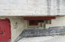 There was another machine gun in a flank fire position of the bunker that covered the entrance. It is not entirely clear which machine gun was used here. The weapon was fixed to a box stand (Untersetzkasten) with the corresponding gun mount. The flank fire position had a 7P7 armoured embrasure plate with a thickness of 10 centimetres and a weight of 7.5 tonnes, in front of which there was a stepped embrasure made of concrete. By means of a slide, the embrasure and observation slit could be closed. In addition, for the viewing slit there was a sliding plate of armoured glass which could be used to observe the situation when under fire.