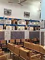 Access to the synagogue involves going through a passage that leads to the building facade (now separated from the street). Above the front door of the building are the Stone Tablets of the Ten Commandments.[1] Inside, the sanctuary is a square room centred around four pillars which once supported an upper women's section and a skylight, before renovations in the 1980s replaced it with a portico above the Torah Ark.[1]