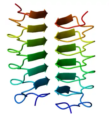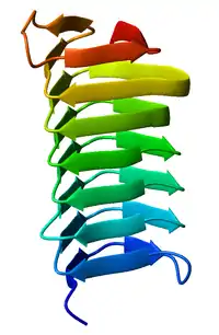 A beta helix is a tandem protein repeat structure formed by the association of parallel beta strands in a helical pattern with either two[1] or three[2] faces. The beta helix is a type of solenoid protein domain. The structure is stabilized by inter-strand hydrogen bonds, protein-protein interactions, and sometimes bound metal ions. Both left- and right-handed beta helices have been identified. These structures are distinct from jelly-roll folds, a different protein structure sometimes known as a "double-stranded beta helix".[3][4]