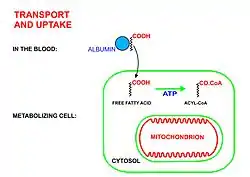 Free fatty acids cannot penetrate any biological membrane due to their negative charge. Free fatty acids must cross the cell membrane through specific transport proteins, such as the SLC27 family fatty acid transport protein.[2][3] Once in the cytosol, the following processes bring fatty acids into the mitochondrial matrix so that beta-oxidation can take place.