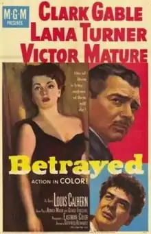 Betrayed is a 1954 Eastmancolor US/British international co-production war drama film directed by Gottfried Reinhardt from a screenplay by Ronald Millar and George Froeschel, and starring Clark Gable, Lana Turner, Victor Mature, and Louis Calhern. The musical score was by Walter Goehr and Bronislau Kaper, and the cinematography by Freddie Young. The picture, Gable's last for Metro-Goldwyn-Mayer, was filmed on location in the Netherlands and England, and was based on the story of turncoat Dutch resistance leader Christiaan Lindemans, also known as "King Kong". The supporting cast features O. E. Hasse, Wilfrid Hyde-White, Ian Carmichael, Niall MacGinnis, and Theodore Bikel. Betrayed was the fourth and final movie in which Gable played opposite Turner, and their third pairing set during World War II. (They played comrades, not simply lovers, in all three war films.)