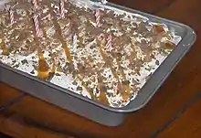 The cake's moist center is typically created by inserting a fork into the cake several times and filling the holes with a mixture containing sugar and a flavoring or fruit such as pineapple.[6][7] It is traditionally baked using a 13 by 9 by 2-inch pan and then refrigerated and eaten cold. The basic recipe for the cake has been altered depending on the tastes of the person making the cake and alternates include vanilla, banana, or candy flavors.[8][9][10]
