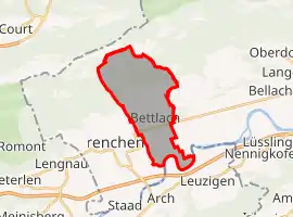 Bettlach has an area, as of 2009, of 12.21 square kilometers (4.71 sq mi). Of this area, 5.67 km2 (2.19 sq mi) or 46.4% is used for agricultural purposes, while 4.59 km2 (1.77 sq mi) or 37.6% is forested. Of the rest of the land, 1.64 km2 (0.63 sq mi) or 13.4% is settled (buildings or roads), 0.17 km2 (0.066 sq mi) or 1.4% is either rivers or lakes and 0.15 km2 (37 acres) or 1.2% is unproductive land.[4]
