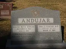 Betty Andujar died on June 8, 1997, and was survived by her husband. As a state senator, she was interred at the Texas State Cemetery in Austin. The widower later married Mary Parker.[10] After his death in August 2003, he was buried by his request next to his first wife at the Texas State Cemetery.[6]