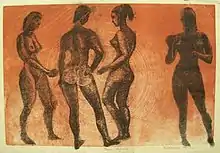 During the remainder of the 1930s Parish continued to exhibit exhibited etchings, woodblocks, and watercolors in the Washington Square outdoor exhibits and Fine Arts Guild.[13] Her work also appeared in group shows at places such as the Corcoran Gallery[14] and the galleries of the Municipal Art Committee.[15][note 5] She also joined and began appearing in annual exhibitions of the National Association of Women Painters and Sculptors.[17] In 1939 she was awarded a prize in the National Association of Women Painters and Sculptors fiftieth anniversary exhibition.[18] An image of the prize-winning painting, a landscape called "The Lower Lot," appeared with the New York Times article describing the show.[18] During the late 1930s she made prints as an employee of the Federal Art Project of the Works Progress Administration.[19]