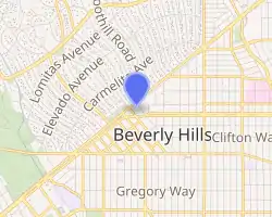 The building is surrounded by North Santa Monica Boulevard, North Rexford Drive, South Santa Monica Boulevard, and North Crescent Drive.[1] Its main entrance is at 455 North Rexford Drive, which faces the Beverly Hills Public Library, adjacent to the Beverly Hills Police Department.[1][2][3] A few doors below on North Rexford Drive is the Beverly Hills Fire Department, next to the Beverly Hills 9/11 Memorial Garden.[1] Behind it, on South Santa Monica Boulevard, is the Beverly Hills Civic Center.[1]