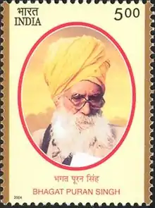 Commemorative postage stamps of Bhagat Puran Singh were released by the Ministry of Communications & Information Technology in 2004.[3][4] The stamp is in the denomination of Rs five.[5]