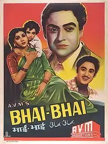 Bhai-Bhai (transl. Brothers) is a 1956 Hindi-language drama film directed by M. V. Raman for A. V. M. Productions.[1][2] It had screenplay by Jawar N. Sitaraman, with Hindi screen adaptation of the Tamil film Ratha Paasam directed by C.V. Sridhar. The music director was Madan Mohan,[3] with dialogues and lyrics written by Rajendra Krishan. One of the popular songs from the film was "Ae Dil Mujhe Bata De" (Oh Heart Tell Me), sung by Geeta Dutt, "in an unabrasive fast tempo".[4] The song became one of Madan Mohan's earliest hits, and the music of the film in journalist-author Bharatan's words, went on to "conquer the box office".[1][5]