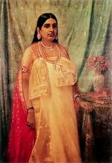 The Queen holds her receptions in a room on the first floor... but she herself in national costume, looks like a charming personification of India. She has a regular profile, pure features and magnificent large eyes, in fact all the beauty of her race. In accordance with the tradition of the Nayar family her jet black hair is wound round her forehead. Enormous rings of diamonds and rubies hang from her earlobes and her naked arms, which are much bejeweled, are unconcealed by her velvet bodice... Oh! it is easy to imagine the degree of refinement to which a noble lady of sovereign race may attain in this country where even the lower classes are cultured, but the especial charm of the Maharanee lies in her benevolence and in a reserved and gentle sweetness... so before leaving I seek to impress her image on my mind, for her face does not seem to belong to our times, and it is only in old Indian miniatures that I have had a glimpse of such princesses.