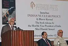 He holds a bachelor's degree in political science from the University of California, Santa Barbara and received a Masters in political science from University of California, Los Angeles in 1975.[6] Karnad served as a Member of the National Security Advisory Board, National Security Council, Government of India,[7] and Member of the Nuclear Doctrine Drafting Group,[8] and formerly Advisor, Defense Expenditure to the Finance Commission, India.[9] He has been a visiting scholar at Princeton University, the University of Pennsylvania, the Shanghai Institute for International Studies, and The Stimson Center in Washington.[10] He is frequently contacted by the Indian government and the Indian military for policy suggestions.[11] He is also a regular lecturer at the highest military training institutions and forums and conducts an annual Strategic Nuclear Orientation Course for senior armed forces officers for the Integrated Defence Staff, Ministry of Defence.[12]