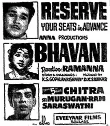 Bhavani is a 1967 Indian Tamil-language film directed by T. R. Ramanna and written by K. S. Gopalakrishnan. It was produced by D. K. Shankar of Anna Productions, who doubled as editor.[1] The film stars Jaishankar and Vijayakumari. It was released on 5 August 1967.