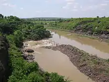 The dams were constructed of cyclopean masonry on a massive scale. The dam to the north is preserved, but the one immediately below the temple was knocked down by an exceptional surge in the Monsoon that occurred in the mid-eleventh century.[1] A myth about the Bhojpur dams has emerged thanks to the writing of William Kincaid.[2] He mis-interpreted an account in a Persian chronicle (recording that a dam was opened on the orders of Hoshang Shah of Malwa), as referring to Bhojpur, an idea elaborated by U. N. Day in 1965 and repeated subsequently in the years that followed.[3] The account, translated by U. N. Day from Persian, states that the king pulled down a dam at the request of local merchants in Bhopal and Vidisha whose caravans were being raided by bandits who would take refuge at an inaccessible spot protected by the lake. This account refers to the Bhojtal at Bhopal where even today an island in the middle of the lake can be seen. The dam at Bhopal was subsequently repaired and further raised when the Kamlapati Palace was constructed in the eighteenth century.