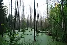 Białowieża National Park (Polish: Białowieski Park Narodowy) is a National Park in Podlaskie Voivodeship, in Eastern Poland adjacent with the border with Belarus. The total area of the park is 105.2 square kilometres (40.6 sq mi). It is located 62 km (39 mi) southeast of Białystok (Poland). It is known for the protection of the best preserved part of the Białowieża Forest, Europe's last temperate primaeval forest fragment that once allegedly stretched across the European Plain. It is home to the world's largest population of European bison (Polish: żubr), the continent's heaviest land animals.[2] The border between the two countries runs through the forest, the Belovezhskaya Pushcha National Park is adjacent on the Belarus side of the border. There is a border crossing for hikers and cyclists within the forest. According to one study, the park brings in tourist revenues of about 72 million zlotys per year.[3]
