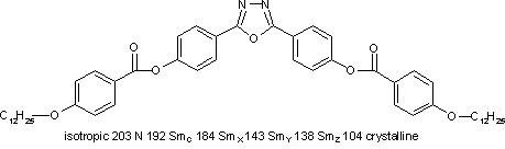 The first report of a thermotropic biaxial nematic appeared in 2004[1][2] based on a boomerang shaped oxadiazole bent-core mesogen. The biaxial nematic phase for this particular compound only occurs at temperatures around 200 °C and is preceded by as yet unidentified smectic phases.