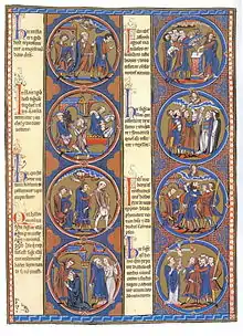 The Bible of St Louis, also called the Rich Bible of Toledo or simply the Toledo Bible, is a Bible moralisée in three volumes, made between 1226 and 1234 for King Louis IX of France (b. 1214) at the request of his mother Blanche of Castile.[1] It is an illuminated manuscript that contains selections of the text of the Bible, along with a commentary and illustrations. Each page pairs Old and New Testament episodes with illustrations explaining their moral significance in terms of typology. Every excerpt of the Bible is illustrated with two miniatures. The first shows a representation of the text fragment as such, the second shows a theological or an allegorical scene explaining the text fragment in the light of the teachings of the Church. The miniatures are accompanied by the Bible text and by a short comment on the typological relationship between the two images.