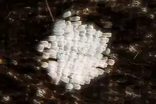 There are six steps that males take in order to mate with a female: location, orientation, flickering, thrust, attempting, and copulation.[7] The males are able to attract the females with the numerous androconia located on their wings.[7] These spots exude pheromones that attract female butterflies. The flickering of their wings helps spread their pheromones throughout the surrounding air.[7] While mating, males present spermatophores to the females, which contain a wide variety of nutrients that augment the females' reproductive success.[6]