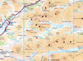 From the west at Attadale there is an 13 km (8 mi) track along which a mountain bike may be ridden, with difficulty, to the open bothy at Ben Dronaig Lodge which is maintained by the Attadale Estate to a very high standard.[22][23][24] From bothy to Bidein is another 7.2 km (4.5 mi) on a stalkers' path.[25] A shorter 9.7 km (6 mi) stalkers' path leads to this bothy from Achintee (Strathcarron station).[22][26]