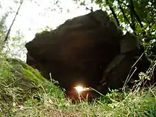According to Karl Benjamin Preusker, several rocks in Upper Lusatia were considered prehistoric offering altars. Among these he counted a rock on Bieleboh, the so-called "Bieleboh altar".[3][5] Local historians from Sohland an der Spree examined this presumed altar for its possible calendarial use for observations of the sun in 2007. It could be shown that an eye-shaped opening through the rock, the Teufelsauge ("devil's eye"), allows to determine the day of the equinox when the light of the rising sun passes through it.[6][7]