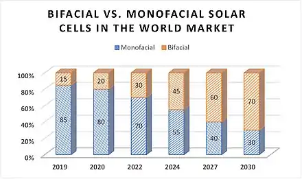 By 2020, the ENF Solar directory of solar companies lists 184 producers of bifacial solar panels, and according to the International Technology Roadmap for Photovoltaics, they held a 20% share of the overall PV market and its forecast is that this share will rise to 70% by 2030. When looking back on the development history of the BSC, it seems clear that fully industrializing the monofacial PV solar cells and the development of its nowadays booming market, was a necessary condition for BSCs to become a next step in the advancement of PV solar cell technology, with a solar market and industry that can thus make the most of its performance advantages.