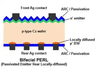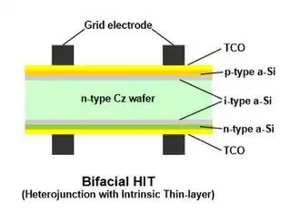 With the turn of the millennium, paths towards the industrial production of BSC cells and modules started to be laid again. In 2000, Japanese manufacturer Hitachi released results of its research in BSCs with another transistor-like n+pn+ cell with 21.3% front and 19.8% rear efficiency.[33] By 2003 Hitachi had developed BSC module technology that was licensed in 2006 to the US company Prism Solar.[34] In 2004 a team led by Prof. Andrew Blakers at the Australian National University published its first results on the so-called Sliver BSC technology, that had taken the design route previously proposed by Mori and also realized by IES-UPM by Sangrador and Sala, i.e., a stack of laterally connected bifacial cells requiring no metal grids, however, by then with more advanced means with which thousands of cells were micromachined out of one p-type silicon wafer.[35][36] The technology was later transferred to Origin Energy that planned large-scale manufacturing for the Australian market by 2008, but finally this never occurred due to price pressure from Chinese competition.[37] In 2012 Sanyo (later acquired by Panasonic) successfully launches industrial production of bifacial PV modules, based on its HIT (Heterojunction with Intrinsic Thin layer) technology.[38][39] By 2010, ECN releases results on its research on BSCs, based on the by then classical p+nn+ Back Surface Field BSC.[40] This technology, dubbed n-PASHA, was transferred to the leading Chinese PV manufacturer Yingli by 2012, that began to commercialize them under the brand name Panda.[41] Yingli was at that time the no.1 PV producer holding 10% of the world's shipments, and this technology transfer by ECN can be considered a milestone in the ultimate coming of age of BSCs, in which the technology is picked up by the, by then, mighty Chinese manufacturers mainly responsible for the steep decrease experienced PV prices since the beginning of the 2010s.