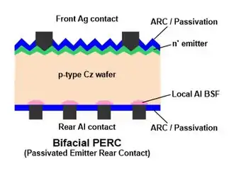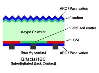 Besides Isofoton, some other PV manufacturers, however, specialized in space applications, reported developments of BSCs at a laboratory scale such as COMSAT in 1980, Solarex in 1981 or AEG Telefunken in 1984.[24][25][26] During the late 1980s and the 1990s research and improvement of bifacial solar cell technology continued. In 1987 Jaeger and Hezel at ISFH (Institute for Solar Energy Research in Hamelin) successfully produced a new BSC design based on a single junction n+p, in which the rear contact was replaced by a metal grid and all intermetallic surfaces were passivated with PECVD-grown silicon nitride, this resulting in 15% and 13.2% under front and rear illumination respectively.[27] In this way, these devices presented a Metal Insulator Semiconductor-Inversion Layer (MIS-IL) front junction. Ten years later, the same research group replaced this MIS layer with a diffused pn junction to produce BSC laboratory devices with 20.1% front and 17.2% rear efficiencies.[28] In 1997, Glunz et al., at the Fraunhofer Institute for Solar Energy Systems, produced n+pn+ 4 cm2 devices with 20.6% front and 20.2% rear conversion efficiencies.[29] This was a double junction cell (one of the junctions not connected or "floating") with the metal grid only on the rear surface, i.e. operating an interdigitated back contact (IBC) solar BSC and with the floating front junction performing as passivation. By 1997, SunPower, by then the solar cell manufacturer producing the highest efficiency cells through its back contact design, published research by a team led by its founder, Richard Swanson, on a back contact BSC with front efficiency of 21.9% and rear efficiency of 13.9%.[30] A prototype series of cells and modules were produced but never made it to mass production.