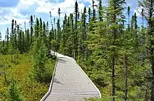 A recent addition to the Big Bog State Recreation Area is a raised boardwalk across the bog which allows visitors to explore one mile (1.6 km) into the "islands" of spruce within the bog, as well as the open wetlands. The boardwalk was designed to allow up to 37% of natural sunlight to fall through, allowing delicate bog plants to continue to grow under the walkway. Numerous signs identify aspects of the bog, including pitcher plants and an early failed attempt at draining the swamp lands. A parking pass needs to be purchased at the nature center nine miles south, on the northern side of the town of Waskish.