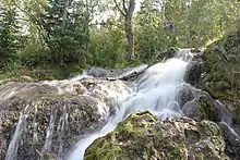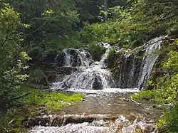 A series of springs feed the small stream that flows through the park, and its waterfalls flow across deposits of tufa that precipitated from the spring water.[1] The springs and stream have consistently high year-round flow rates,[2] which is probably why the old creamery and the fish hatchery were established there.[1]