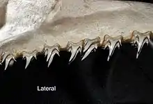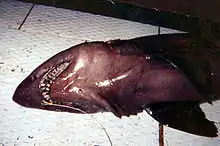 The bigeye sand tiger (Odontaspis noronhai) is an extremely rare species of mackerel shark in the family Odontaspididae, with a possible worldwide distribution. A large, bulky species reaching at least 3.6 m (12 ft) in length, the bigeye sand tiger has a long bulbous snout, large orange eyes without nictitating membranes, and a capacious mouth with the narrow teeth prominently exposed. It can be distinguished from the similar smalltooth sand tiger (O. ferox) by its teeth, which have only one lateral cusplet on each side, and by its uniformly dark brown color.
