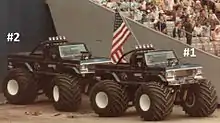 | Bigfoot 2 | 1982 | Completed in the fall of 1982 to meet demand for appearance of the original truck, Bigfoot 2 was the first monster truck to use 66-inch tall tires, the standard monster truck tire used from that point forward. The truck raced a paddle steamer on the Chattahoochee River in Columbus, Georgia in 1985.[11] Modified in 1992 for the purpose of giving fans monster truck rides in the bed of the vehicle, and renamed SafariFoot. The truck was sold to a private customer in 2000. | ![]() 1 and 2 in St. Louis. Date unknown. |