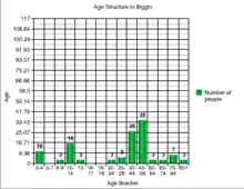 In 2001 Biggin had a population of 117. 29.9% of people living in Biggin were between the ages of forty five to fifty nine and a further 22.2 per cent were thirty to forty four. By the time of the census 2011 the population had increased only slightly to 121.[4] This suggests the area is fairly affluent as over half the population are at or near to an age where they should be peaking in their chosen careers. Only twenty two people are of an age to go to school in Biggin which is an indicator as to why there is no primary school for a five-mile radius.[5]