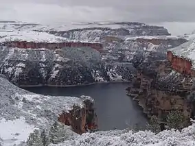 Bighorn Canyon National Recreation Area is a national recreation area established by an act of Congress on October 15, 1966, following the construction of the Yellowtail Dam by the Bureau of Reclamation. It straddles the border between Wyoming and Montana. The dam, named after the famous Crow leader Robert Yellowtail, harnesses the waters of the Bighorn River by turning that variable watercourse into Bighorn Lake. The lake extends 71 miles (114 km) through Wyoming and Montana, 55 miles (89 km) of which lie within the national recreation area.[3] About one third of the park unit is located on the Crow Indian Reservation.[4] Nearly one-quarter of the Pryor Mountains Wild Horse Range lies within the Bighorn Canyon National Recreation Area.[5]