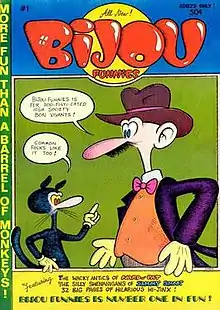 Bijou Funnies was an American underground comix magazine which published eight issues between 1968 and 1973. Edited by Chicago-based cartoonist Jay Lynch, Bijou Funnies featured strong work by the core group of Lynch, Skip Williamson, Robert Crumb, and Jay Kinney,[2] as well as Art Spiegelman, Gilbert Shelton, Justin Green, and Kim Deitch. Bijou Funnies was heavily influenced by Mad magazine,[3] and, along with Zap Comix, is considered one of the titles to launch the underground comix movement.[1]